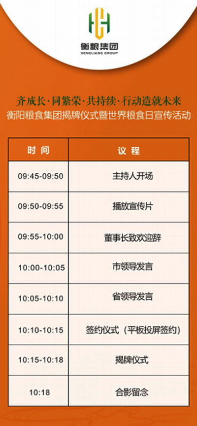 衡陽糧食集團(tuán)揭牌儀式暨世界糧食日宣傳活動(dòng)時(shí)間及議程